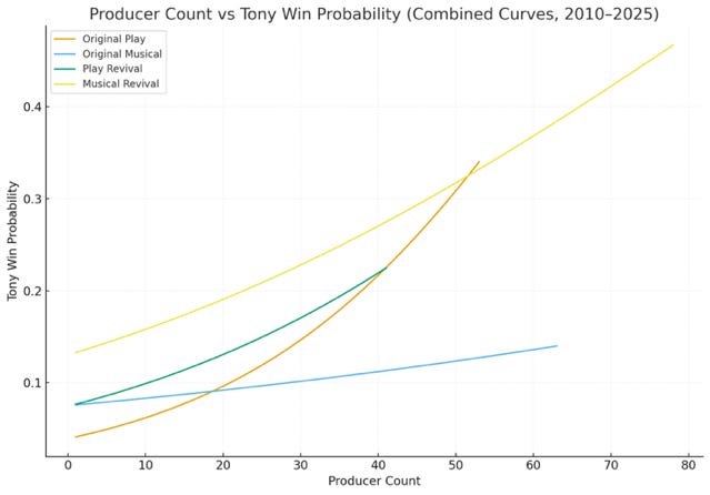 The aggregate picture was hiding the architecture. When I reran the regressions separately for Original Plays, Original Musicals, Play Revivals, and Musical Revivals—each with Tony win as the dependent variable and producer count, grosses, ticket price, and eligibility year as predictors—the entire structure shifted. Patterns that looked meaningful in the monolith dissolved, and the only detectable producer-count signal with any p-significance that mattered surfaced in Original Plays.