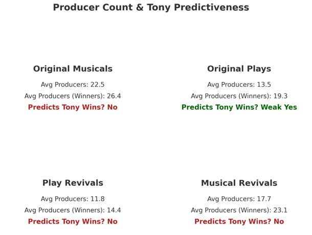 I was having breakfast at Friedman’s on 47th, with someone in the industry I deeply admire, when, between bites of our meal, they suggested I look into Tony Award voting patterns. Specifically: whether shows with more producers tend to win. “The findings might surprise you,” they said, in that tone people use when they already know the answer and want to watch you discover it.